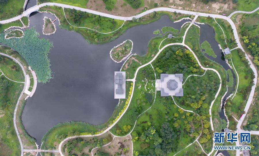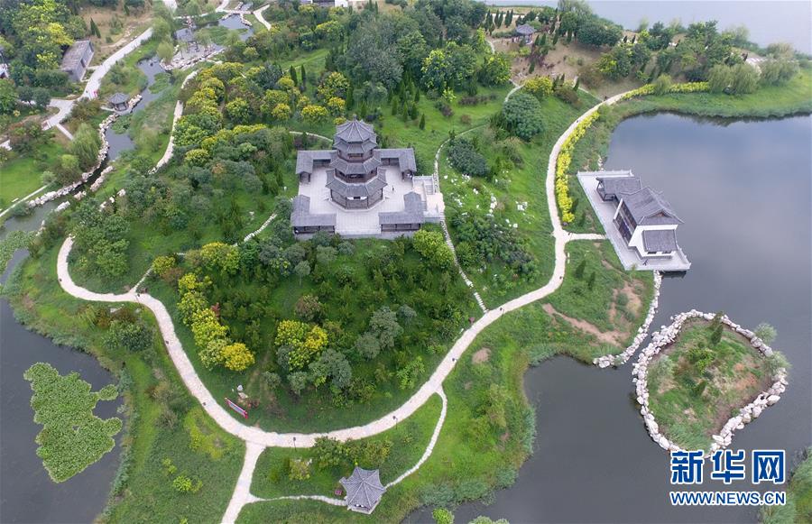 8月19日无人机拍摄的河北省河间市瀛州公园。 河北省河间市瀛州公园位于河间市城区中南部,原来是废弃多年的污水坑塘,生活垃圾和建筑垃圾都曾向这里倾倒,带来环境污染等问题。2012年以来,河间市大力实施城区生态优化工程,打造城市生态“绿肺”,把昔日的废弃污水坑塘建成一座水域面积44公顷、绿地面积51公顷的生态公园,成为市民和游客休闲游玩的好去处。 新华社记者朱旭东摄
