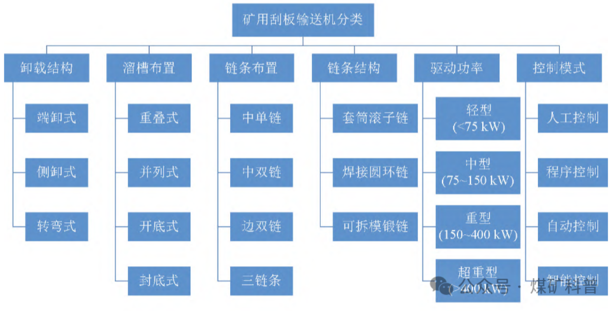 机型图谱:矿用刮板输送机分类包括卸载结构、溜槽布置、链条布置、链条结构、驱动功率、控制模式等。